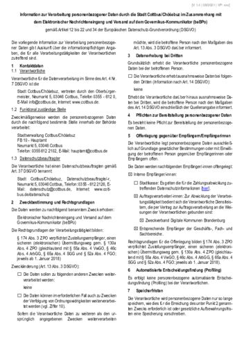 Information zur Verarbeitung personenbezogener Daten durch die Stadt Cottbus/Chóśebuz im Zusammenhang mit dem Elektronischer Nachrichteneingang und Versand auf dem Governikus-Kommunikator (beBPo) gemäß Artikel 12 bis 22 und 34 der Europäischen Datenschutz-Grundverordnung (DSGVO)