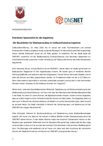 Cottbus/Berlin/Bernau, 24. März 2022: Als im Januar der erste Technikstandort und zentrale Knotenpunkt in Cottbus aufgebaut wurde, wurde der Baubeginn für das erste Quartal 2022 angekündigt. Dieser nächste Meilenstein wurde am 23. März gesetzt. Im westlichen Teil der Stadt setzte die DNS:NET zusammen mit der Stadtverwaltung Cottbus/Chóśebuz zum feierlichen Spatenstich an. Anschließend wurden zusammen mit der Verwaltung und Tiefbauunternehmen die ersten Baustrecken begutachtet.
