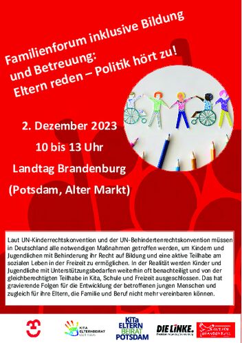 Auf Impuls betroffener Familien organisieren die Fraktion DIE LINKE in Kooperation mit dem kommunalen Behindertenbeirat der Stadt Cottbus und den Kita-Elternbeiräten Cottbus und Potsdam am 02.12.2023 das „Familienforum inklusive Bildung und Betreuung“ im Landtag.