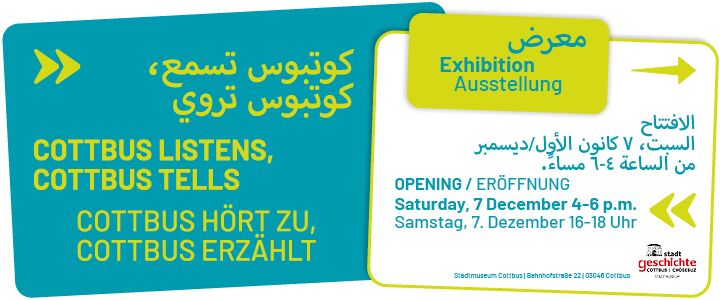 Die Eröffnung der Ausstellung „Cottbus hört zu, Cottbus erzählt“ findet am Samstag, den 7. Dezember 2024, um 16:00 Uhr im Stadtmuseum Cottbus statt.
