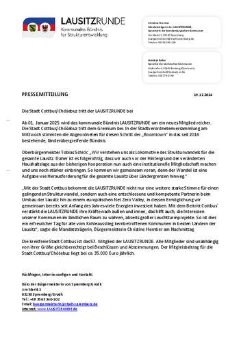 Ab 01. Januar 2025 wird das kommunale Bündnis LAUSITZRUNDE um ein neues Mitglied reicher. Die Stadt Cottbus/Chóśebuz tritt dem Gremium bei. In der Stadtverordnetenversammlung am Mittwoch stimmten die Abgeordneten für diesen Schritt der „Boomtown“ in das seit 2016 bestehende, länderübergreifende Bündnis.