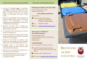 Jeder Eigentümer, dessen Grundstück im Gebiet der Stadt Cottbus liegt und an die öffentliche Abfallentsorgung angeschlossen ist, kann eine 120-Liter-Biotonne bestellen. Sie dient zur Sammlung von Küchen- und Gartenabfällen. Die Bereitstellung der Biotonne ist ein Angebot der Stadt Cottbus, das freiwillig in Anspruch genommen werden kann. Einen Anschlusszwang gibt es nicht. Die Abgabemöglichkeit für Grün-, Strauch- und Baumschnitt auf den Wertstoffhöfen bleibt unverändert bestehen.