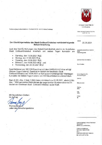 Nach § 28 b Abs. 2 Satz 1 IfSG treten mit Ablauf des 21.05.2021 alle in § 28b Abs. 1 IfSG genannten Maßnahmen der sogenannten Bundesnotbremse im Gebiet der kreisfreien Stadt Cottbus/Chóśebuz außer Kraft.