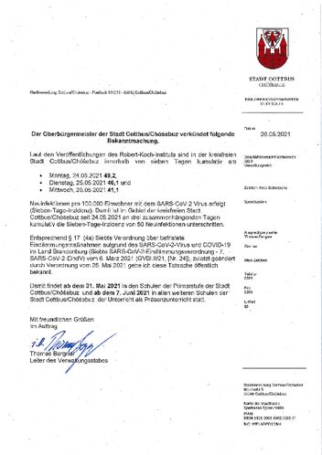 Damit findet ab dem 31. Mai 2021 in den Schulen der Primarstufe der Stadt Cottbus/Chóśebuz und ab dem 7. Juni 2021 in allen weiteren Schulen der Stadt Cottbus/Chóśebuz der Unterricht als Präsenzunterricht statt.