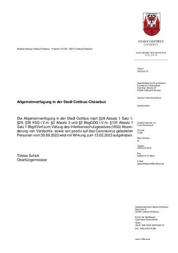 Allgemeinverfügung in der Stadt Cottbus/ Chóśebuz vom 13.02.2023 ‧ PDF ‧ 61.45 KByte ‧ 10.02.2023