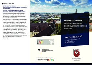 Zwischen dem 4. und 26. November laden die Stadt Cottbus/Chóśebuz, die Jüdische Gemeinde, der Evangelische Kirchenkreis, das Evangelische Gymnasium und Amnesty International alle Cottbuserinnen und Cottbuser zu unterschiedlichen Veranstaltungen ein, die das Gedenken dieser Ereignisse im Fokus haben. Bereits am 4. November 2018 um 10:00 Uhr findet in der Oberkirche ein Gedenkgottesdienst statt. Musikalisch-literarische Programme sowie Filmgespräche werden vom 10. bis 26. November 2018 sowohl in der Oberkirche als auch im Obenkino veranstaltet. Weitere Informationen sind aus den unten verlinkten Flyern abrufbar.