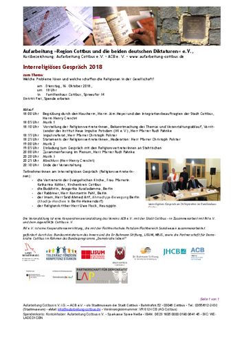 Die Initiative „Aufarbeitung Region Cottbus und die beiden deutschen Diktaturen e.V. (ACB e.V.) “ und der Integrationsbeauftragte der Stadt Cottbus/Chóśebuz laden am 16. Oktober 2018 ein zum Interreligiösen Gespräch im Familienhaus Cottbus am Spreeufer 14. Beginn ist 18:00 Uhr.
