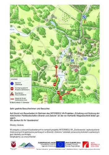 Die Wegebauarbeiten der Stadt Cottbus im Branitzer Park werden aktuell entlang des Schwarzen Sees sowie im Umfeld des südlichen Parkeingangs (Ortslage Branitz) fortgesetzt. Dadurch kommt es zunächst zu einer Sperrung des Zuganges am Museumsweg (an der Branitzer Bäckerei).
