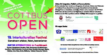 „Cottbus Open" ist eine Gemeinschaftsaktion der Stadt Cottbus/Chóśebuz, der BTU Cottbus-Senftenberg sowie des Jugendhilfe Cottbus e. V. zur Förderung von Offenheit und Toleranz.