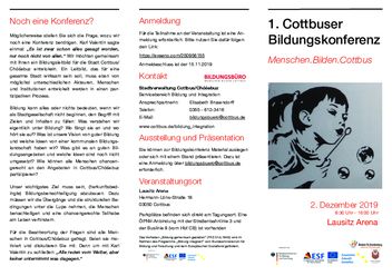 Am 02.12.2019 soll die erste Cottbuser Bildungskonferenz stattfinden, die auch als Kick-off-Veranstaltung für die Erstellung eines Cottbuser Bildungsleitbildes fungieren soll. Ein Leitbild, das für eine gesamte Stadt wirksam sein soll, sollte von möglichst unterschiedlichen Akteuren, Menschen und Institutionen entwickelt werden in einem partizipativen Prozess. Leitfragen für den Prozess werden sein: Was verstehen wir eigentlich unter Bildung? Wo fängt sie an und wo hört sie auf? Was ist unsere Vision von guter Bildung und welche Ideen von einer kommunalen Bildungslandschaft haben wir? Was gibt es an guten Bildungsangeboten und welche Ideen sind noch nicht umgesetzt? Wie können alle Menschen chancengerecht an den Angeboten in Cottbus/Chóśebuz partizipieren? Die Konferenz findet in der Lausitz Arena statt. Nähere Informationen finden Sie auf der Homepage der Stadt unter www.cottbus.de/bildung_integration und auf unten verlinktem Flyer.