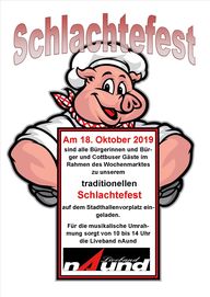 Am 18.10.2019 findet von 08:00 Uhr bis 15:00 Uhr das „8. Große Schlachtefest" auf dem Freitagsmarkt vor der Stadthalle statt.