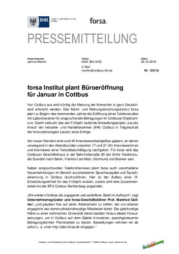 Verzahnung bringt Ertrag: Mit diesen Worten begrüßt Oberbürgermeister Holger Kelch die Ansiedlung des Markt- und Meinungsforschungsinstitutes forsa, das im Januar einen Standort in Cottbus/Chóśebuz eröffnen wird. „Die Region hat hier an einem Strang gezogen. Das war und bleibt wichtig. IHK, das Projektteam Lausitz-Invest, forsa selbst und auch die kommunale Wirtschaftsförderung mit der Entwicklungsgesellschaft Cottbus haben eng kooperiert“, erklärt OB Holger Kelch.