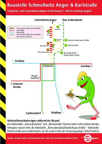 • Ersatzverkehr der Linien 1 und 4 zwischen Stadthalle und Schmellwitz zwischen 1. Juli und 7. August 2020