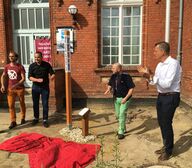 Oberbürgermeister Holger Kelch dankte den Initiatoren und erklärte: „Der Standort am Bahnhof hat für Cottbus/Chóśebuz große Symbolik. Vernunft ist der Schlüssel für atomare Abrüstung, doch die Vernunft hat noch nicht gesiegt. Die Frage Krieg oder Frieden verdient keine Ideologie, für den Frieden müssen wir zusammenstehen.“ Der Pfahl - weltweit gibt es ca. 250.000 - trägt die Aufschrift: Möge Friede auf Erden sein - auch in Englisch, Japanisch und, weltweit einzigartig, auf Sorbisch. Stadtverwaltung
