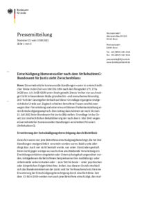 Menschen, die aufgrund des Verbots einvernehmlicher homosexueller Handlungen (§§ 175, 175a StGB bzw. § 151 StGB-DDR) strafrechtlich verurteilt worden sind oder im Gefängnis eine Freiheitsstrafe absitzen mussten, können jetzt entschädigt werden. Grundlagen sind das „Gesetz zur strafrechtlichen Rehabilitierung der nach dem 8. Mai 1945 wegen einvernehmlicher homosexueller Handlungen verurteilten Personen" (StrRehaHomG) und einer dazugehörigen Richtlinie. Das StrRehaHomG hebt zudem die damaligen strafrechtlichen Urteile kraft Gesetzes auf (Rehabilitierung) und regelt auch die Tilgung eventueller Eintragungen im Bundeszentralregister. Darauf macht jetzt das Bundesamt für Justiz (BfJ) aufmerksam.