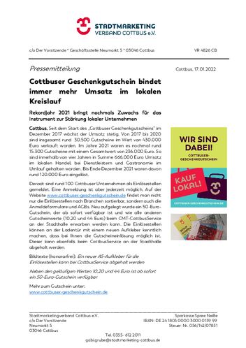 Rekordjahr 2021 bringt nochmals Zuwachs für das Instrument zur Stärkung lokaler Unternehmen Cottbus. Seit dem Start des „Cottbuser Geschenkgutscheins“ im Dezember 2017 wächst der Umsatz stetig. Von 2017 bis 2020 sind insgesamt rund 30.500 Gutscheine im Wert von 430.000 Euro verkauft worden. Im Jahre 2021 waren es nochmal rund 15.300 Gutscheine mit einem Gesamtwert von 236.000 Euro. So sind innerhalb von vier Jahren in Summe 666.000 Euro Umsatz im lokalen Handel, bei Dienstleistern und Gastronomie im Umlauf gehalten worden. Bis Ende Dezember 2021 waren davon rund 120.000 Euro eingelöst.