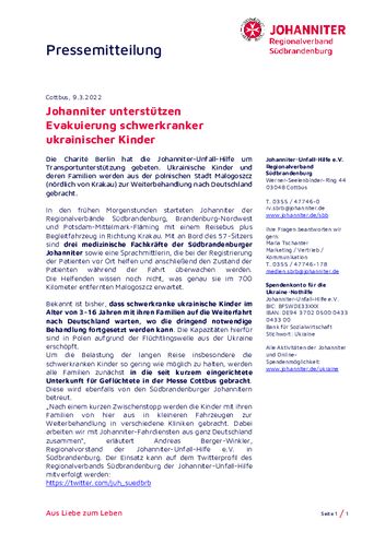 Die Charité Berlin hat die Johanniter-Unfall-Hilfe um Transportunterstützung gebeten. Ukrainische Kinder und deren Familien werden aus der polnischen Stadt Malogoszcz (nördlich von Krakau) zur Weiterbehandlung nach Deutschland gebracht.