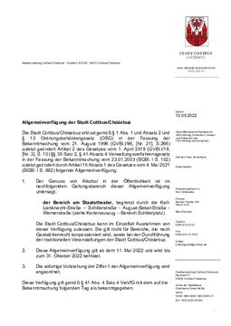Die Allgemeinverfügung sowie die Karte mit dem genauen Bereich ist auf www.cottbus.de/alkoholverbot und am Ende dieser Seite veröffentlicht sowie in den Foyers der Verwaltungsstandorte am Neumarkt, in der Karl-Marx-Straße (Technisches Rathaus) und im Sicherheitszentrum in der Berliner Straße 154 ausgehangen.
