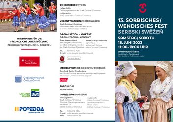 Nach zweijähriger Pause findet am Samstag, 18.06.2022, von 11:00 bis 18:00 Uhr das 13. sorbische/wendische Fest – Serbski swěźeń statt. Das Fest im Rahmen des Cottbuser Stadtfestes auf der rbb-Bühne im Park an der Puschkinpromenade steht unter der Schirmherrschaft von Oberbürgermeister Holger Kelch.