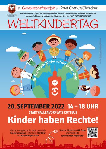 Zum 30. Mal findet am 20.09.2022 von 14:00 bis 18:00 Uhr der Cottbuser Weltkindertag auf dem Stadthallenvorplatz statt. Veranstaltet wird er vom Jugendamt der Stadt Cottbus/Chóśebuz in Kooperation mit anerkannten Trägern der freien Jugendhilfe und weiteren Einrichtungen und Projekten.
