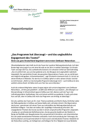 Ohrenbetäubender Lärm hallt durch das Foyer der Lausitzer Rettungsdienstschule. Auf dem Boden liegt eine junge Frau mit einer Wunde an der Stirn in stabiler Seitenlage. Ein Einsatz-Team versorgt die Frau. Das authentische Szenario: Ein schwerer Unfall auf dem Bahnsteig. „Das ist wirklich toll, was uns hier geboten wird, die Übungen sind unglaublich realistisch dargestellt. Der persönliche Einsatz des gesamten Organisations-Teams, uns so viel Wissen wie möglich mitzugeben, ist bemerkenswert“, sagt Constantin Liermann-Koch. Er ist Arzt an einem Klinikum in Münster, für den Kurs in Cottbus opfert er extra seinen Urlaub. Und hat es nicht bereut: „Nicht nur das kompakte Programm überzeugt mich – auch Cottbus ist eine wirklich schöne Stadt. Ich fühle mich vom Flair her wie in Münster.“