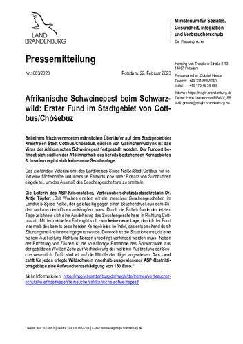Die Leiterin des ASP-Krisenstabes, Verbraucherschutzstaatssekretärin Dr. Antje Töpfer: „Seit Wochen erleben wir ein intensives Seuchengeschehen im Landkreis Spree-Neiße, der gleichzeitig gegen einen Seuchendruck aus dem Süden und aus dem Osten ankämpfen muss. Durch die Fallwildfunde der letzten Tage zeichnete sich eine Ausdehnung des Seuchengeschehens in Richtung Cottbus ab. Mit dem aktuellen Fall ergibt sich zwar keine neue Lage, da sich der Fund innerhalb des bereits bestehenden Kerngebietes befindet, das entsprechend durch Zäunungsmaßnahmen eingegrenzt wurde. Dennoch ist die Situation ernst, da eine weitere Ausbreitung Richtung Norden unbedingt verhindert werden muss. Neben der Errichtung von Zäunen ist die vollständige Entnahme des Schwarzwilds aus der gebildeten Weißen Zone zur Verhinderung der weiteren Ausbreitung der Seuche wesentlich. Dafür sind wir auf die Mithilfe der Jäger angewiesen. Das Land zahlt für jedes erlegte Wildschwein innerhalb ausgewiesener ASP-Restriktionsgebiete eine Aufwandsentschädigung von 150 Euro.“
