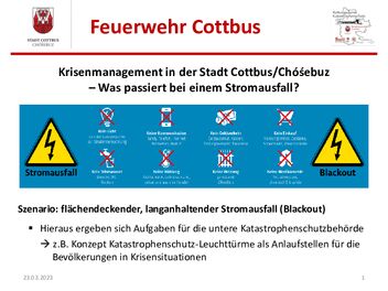 Die Stadt Cottbus/Chóśebuz hat weitere Vorbereitungen getroffen, um bei einem möglichen Blackout oder einer Gasmangellage reagieren zu können. Die Grundzüge eines entsprechenden Konzeptes stellten Oberbürgermeister Tobias Schick und der Leiter der Leitstelle Lausitz, Ingolf Zellmann, am Mittwoch (22.02.2023) während der Sitzung der Stadtverordnetenversammlung vor.