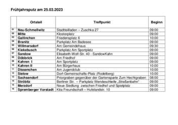 Treffpunkt und den genauen Ort für den Frühjahrsputz findet man auf www.cottbus.de sowie in den Aushängen in den Ortsteilen. Hilfreich ist es, wenn Werkzeug - Hacke, Rechen oder Müllbeutel – mitgebracht werden.