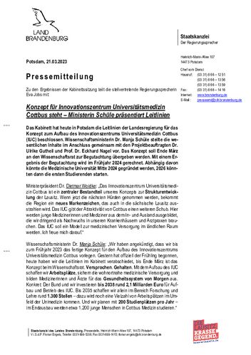 Das Kabinett hat heute in Potsdam die Leitlinien der Landesregierung für das Konzept zum Aufbau des Innovationszentrums Universitätsmedizin Cottbus (IUC) beschlossen. Wissenschaftsministerin Dr. Manja Schüle stellte die wesentlichen Inhalte im Anschluss gemeinsam mit den Projektbeauftragten Dr. Ulrike Gutheil und Prof. Dr. Eckhard Nagel vor. Das Konzept soll Ende März an den Wissenschaftsrat zur Begutachtung übergeben werden. Mit einem Ergebnis der Begutachtung wird im Frühjahr 2024 gerechnet. Abhängig davon könnte die Medizinische Universität Mitte 2024 gegründet werden, 2026 könnten dann die ersten Studierenden starten.