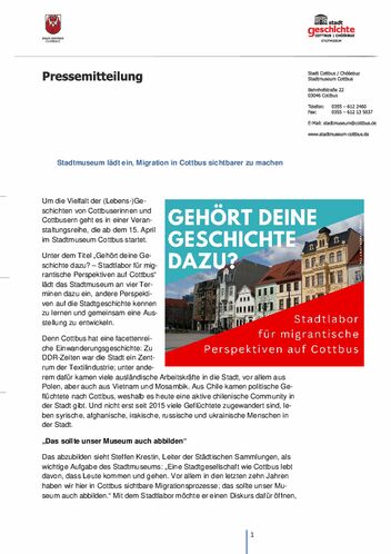 Um die Vielfalt der (Lebens-)Geschichten von Cottbuserinnen und Cottbusern geht es in einer Veranstaltungsreihe, die ab dem 15. April im Stadtmuseum Cottbus startet. Unter dem Titel „Gehört deine Geschichte dazu? – Stadtlabor für migrantische Perspektiven auf Cottbus “lädt das Stadtmuseum an vier Terminen dazu ein, andere Perspektiven auf die Stadtgeschichte kennen zu lernen und gemeinsam eine Ausstellung zu entwickeln.