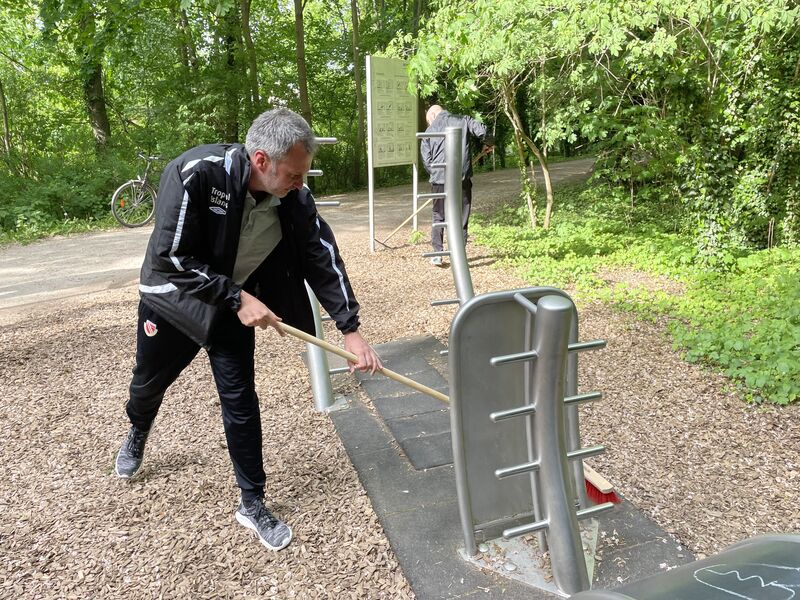 Oberbürgermeister Tobias Schick hat am Mittwochabend gemeinsam mit Weggefährten aus dem Stadtsportbund die Geräte an der Spreemeile am Elisabeth-Wolf-Ufer in Sandow repariert und gewartet.