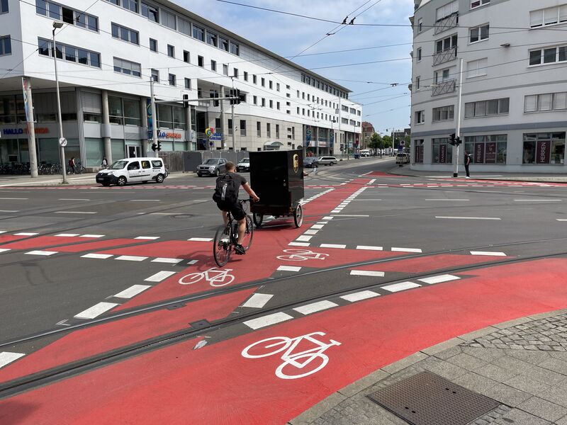 An mehreren Standorten in Cottbus/Chóśebuz, vornehmlich an Kreuzungen, sind in den zurückliegenden Tagen Radwege rot markiert worden. Ziel ist es, die Verkehrssicherheit zu erhöhen, in dem die Radwege besser wahrnehmbar sind. Gleichzeitig dienen die Markierungen mit Fahrradpiktogrammen und Zweirichtungspfeilen auch der klaren Verkehrsorganisation für die Radfahrerinnen und Radfahrer.