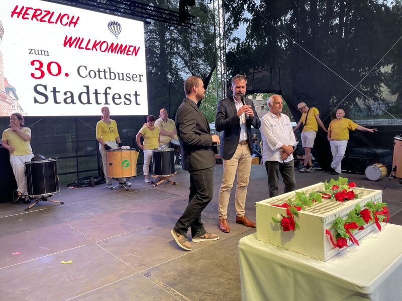 Oberbürgermeister Tobias Schick hat am Freitag, 16.06.2023, den Startschuss zu drei tollen Feier-Tagen in Cottbus/Chóśebuz gegeben: Bis zum Sonntag wird das Stadtfest gefeiert; es ist das 30. Veranstalter und für das Programm verantwortlich ist die Cottbuser Agentur Coex Veranstaltungs GmbH, mit der ein entsprechender Konzessionsvertrag abgeschlossen ist.