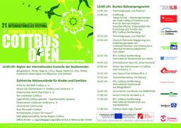 Am Sonntag eröffnet OB Tobias Schick das interkulturelle Festival Cottbus open auf der kleinen Bühne im Park an der Puschkinpromenade. Auftakt ist um 13:00 Uhr mit der Trommelgruppe „Los Pepinos“. Auf der internationalen Essmeile gibt es kulinarische Entdeckungen aus zwölf Ländern, zumeist angeboten von internationalen Studierenden des BTU Cottbus-Senftenberg. Bis 18:00 Uhr kann man bei Cottbus Open auf eine Reise gehen durch verschiedene Kulturen, Tänze und Musiken.