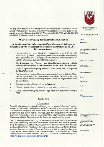 Die Stadt Cottbus/Chóśebuz schränkt ab dem 22.07.2023 tagsüber die Entnahme von Wasser aus Seen und Flüssen ein. Eine entsprechende Allgemeinverfügung der Unteren Wasserbehörde des Fachbereichs Umwelt und Natur der Stadt Cottbus/Chóśebuz ist am Freitag, 21.07.2023 auf www.cottbus.de veröffentlicht worden.