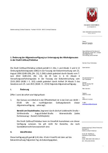 Die Stadt Cottbus/Chóśebuz hat bereits mit Wirkung zum 31.05.2023 eine Allgemeinverfügung erlassen, die den Alkoholkonsum im Bereich des Schillerplatzes bis zum 31.10.2023 untersagt. Diese Verfügung wird nunmehr angepasst.