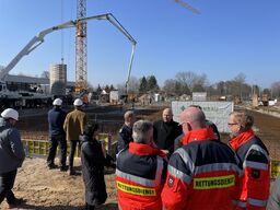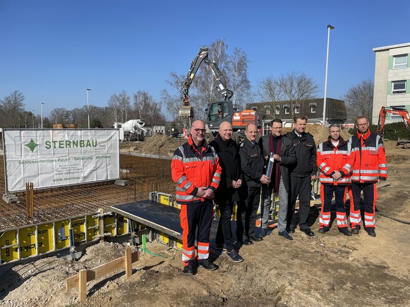 Das Cottbuser Carl-Thiem-Klinikum (CTK) und die Stadt Cottbus kooperieren eng bei dem Neubau einer Rettungswache für die Feuerwehr Cottbus. Auf einer Gesamtnutz-fläche von rund 1750 Quadratmetern entsteht derzeit ein 44 Meter langes, 24 Meter breites und neun Meter hohes Funktionalgebäude zur Sicherstellung der Anforderungen eines modernen Rettungsdienstes. Die neue Wache gegenüber der Medizinischen Schule an der Welzower Straße ist für etwa 60 Mitarbeitende und Auszubildende des Rettungsdienstes im Schichtsystem vorgesehen. Nachdem im Oktober 2023 der Spatenstich erfolgt ist, fand nun am 8. März die Grundsteinlegung im Beisein von Vertretern des Klinikums, der Stadt Cottbus, der Sternbau GmbH als bauausführende Firma und Vertretern der Cottbuser Berufsfeuerwehr statt.