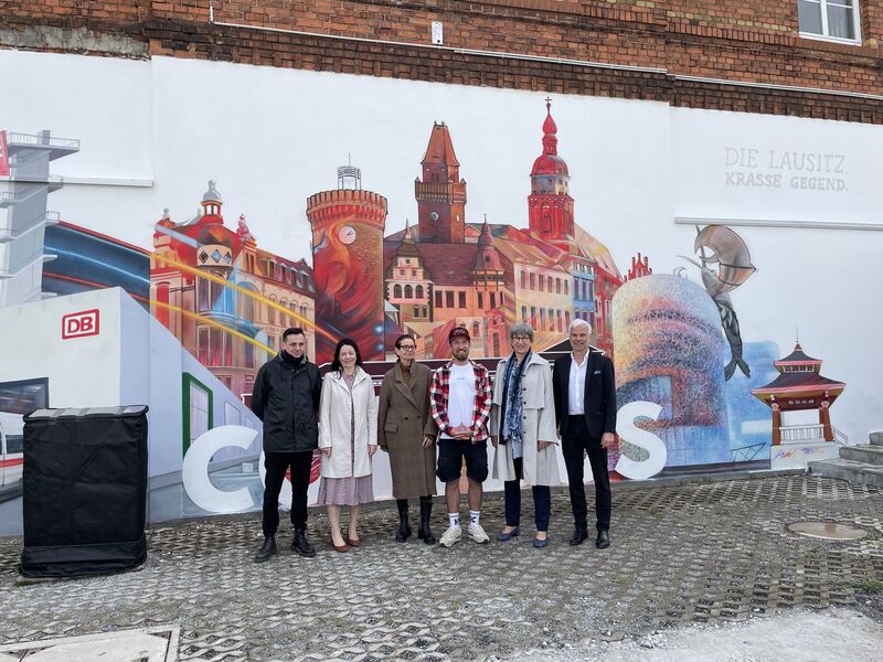 Am Bunten Bahnhof in Cottbus/Chóśebuz ist am Montag, 15.04.2024, ein Wandbild mit Motiven der Stadt und des laufenden Strukturwandels übergeben worden. Gestaltet wurde es von dem Cottbuser Graffiti- Künstler Dirk Hiekel. Das gut 13 Meter lange Wandbild am Giebel des früheren Güterbahnhofes gegenüber des neuen Bahnwerks zeigt eine Skyline der Stadt, u.a. mit Oberkirche, Gerichtsturm, Spremberger Turm, Merzdorfer Aussichtsturm, aber auch dem neuen DB-Werk sowie dem IKMZ und dem Japanischen Teehäuschen.