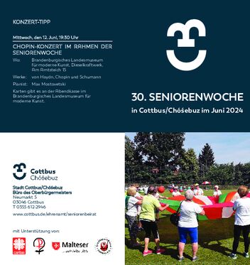 Unter dem Motto „Aktiv und selbstbewusst, solidarisch und mitbestimmend – Seniorinnen und Senioren in Brandenburg“ wird die 30. Brandenburgische Seniorenwoche im Juni auch in Cottbus/Chóśebuz veranstaltet.