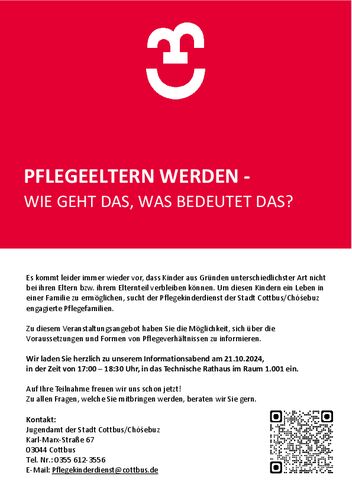 Zu diesem Veranstaltungsangebot haben Sie die Möglichkeit, sich über die Voraussetzungen und Formen von Pflegeverhältnissen zu informieren. Wir laden Sie herzlich zu unserem Informationsabend am 21.10.2024, in der Zeit von 17:00 – 18:30 Uhr, in das Technische Rathaus im Raum 1.001 ein. Auf Ihre Teilnahme freuen wir uns schon jetzt!