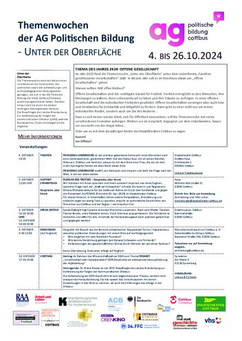 Die Themenwoche „Unter der Oberfläche“ wird von Akteurinnen und Akteuren der historisch-politischen, politischen sowie der aufarbeitungs- und archivpädagogischen Bildungsarbeit getragen, die sich in der AG Politische Bildung der Stadt Cottbus/Chóśebuz zusammengeschlossen haben. Sie finden vom 04.10. bis 26.10.2024 statt.