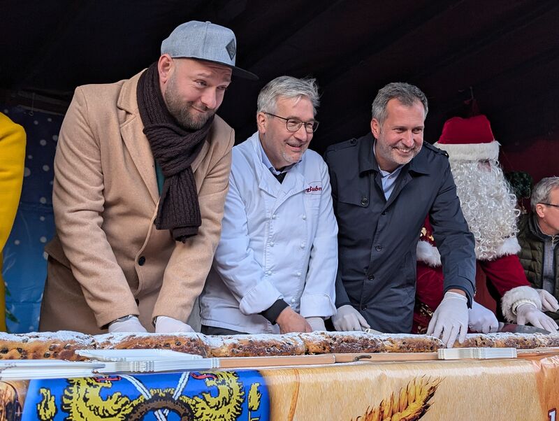 Bei frühlingsnahen Temperaturen ist am Montag, 25.11.2024, der Cottbuser Weihnachtsmarkt eröffnet worden. Oberbürgermeister Tobias Schick und weitere Vertreterinnen und Vertreter der Rathausspitze, des Handwerks, des Altstadtvereins und Stadtverordneten-Vize Benjamin Hanschke schnitten dazu traditionell den von der Bäckerei Bubner gebackenen 6 Meter langen Stollen auf dem Altmarkt an. Der Erlös aus dem Stollenverkauf kommt dem Kinderhospiz „Pusteblume“ zugute.