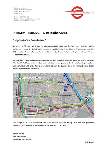 Ab dem 10.12.2024 wird der Straßenbahnverkehr zwischen Ströbitz und Madlow wieder aufgenommen und die Linie 3 verkehrt wieder regulär. Dadurch entfällt der Ersatzverkehr der Linie EV3 zwischen Priorstraße und Hermann-Löns-Straße. Diese Freigabe erfolgt jedoch nur für den Straßenbahnverkehr.