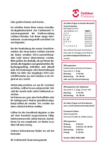 Die Stadt Cottbus/Chóśebuz versendet ab Montag, 24.03.2025, die neuen Grundsteuerbescheide.