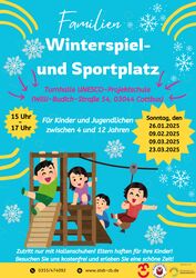 Nächste Termine für den Familien Winterspiel- und Sportplatz sind der 26.01.2025, der 09.02., der 09.03. und der 23.03.2025 jeweils von 15:00 bis 17:00 Uhr. An jedem dieser Tage wird ein anderer Verein vor Ort sein, sich mit seinem Angebot präsentieren und die Kinder zum Mitmachen einladen. Mit dabei sind u. a. der Verein Varieté Fantastique mit Tanz und Artistik, der PSV Cottbus 90 (Abteilung Kampfkünste „Tokugawa“), der VfB Döbbrick und der ESV Lok Raw, Abteilung Hockey.