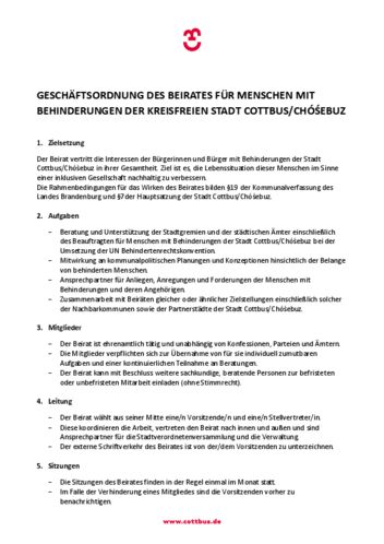 Geschäftsordnung des Beirates für Menschen mit Behinderungen der Stadt Cottbus/ Chóśebuz ‧ PDF ‧ 281.71 KByte ‧ 29.01.2025
