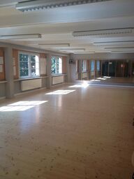 Fußbodenbelag: größtenteils Teppichboden, am einen Ende aber auch eine Tanzfläche mit Holzfußboden
