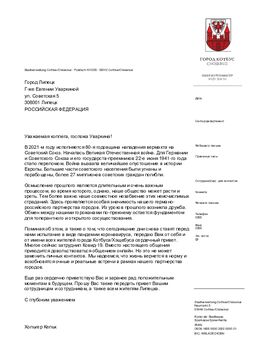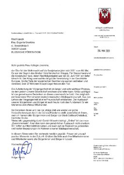 Schreiben des Oberbürgermeisters an die seine Amtskollegin in Lipezk anlässlich des 80. Jahrestages des Überfalls der Wehrmacht auf die Sowjetunion