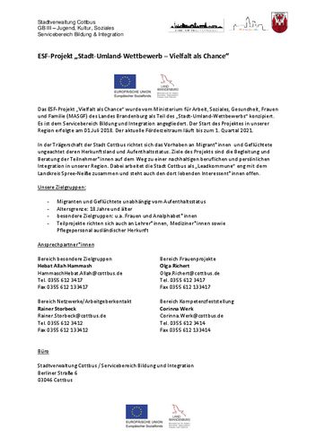 Das ESF-Projekt „Vielfalt als Chance“ wurde vom Ministerium für Arbeit, Soziales, Gesundheit, Frauen und Familie (MASGF) des Landes Brandenburg als Teil des „Stadt-Umland-Wettbewerbs“ konzipiert. Es ist dem Servicebereich Bildung und Integration angegliedert. Der Start des Projektes in unserer Region erfolgte am 01.Juli 2018. Der aktuelle Förderzeitraum läuft bis zum 1. Quartal 2021.