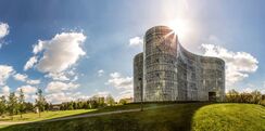 Charakteristisch für dieses Gebäude ist seine gekurvte, äußere Form, die bewirkt, dass es keine Vorder- und Rückseiten besitzt. Der Betrachter verbindet damit eine gleichermaßen empfangene Geste. Mit einer Höhe von ca. 32 Metern über Gelände ist das Gebäude Blickfang und Anziehungspunkt.